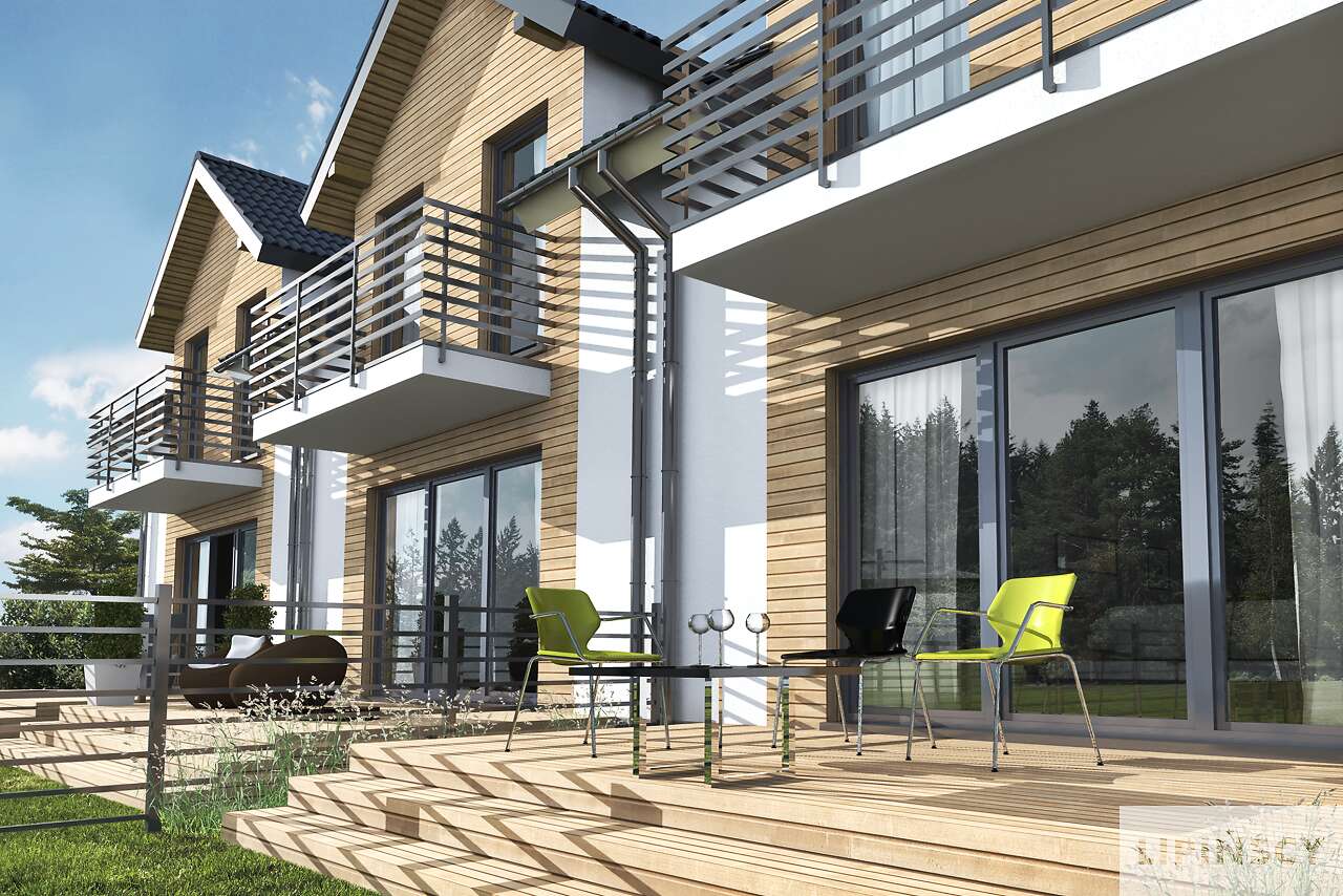 Elegancka, nowoczesna elewacja podkreślona elementami drewnianymi i metalowymi barierkami na balkonach. Funkcjonalny układ wnętrz zapewnia komfort całej rodzinie, a duże przeszklenia w salonie sprawiają, że dom jest pełen światła i otwarty na ogród.
